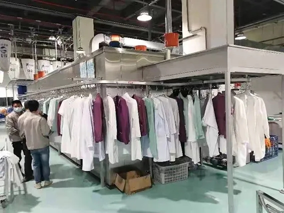 廣州杏林公司負責車間的經理朱俊方熱情接待了華威公司銷售總監趙建偉,趙建偉對設備進行了認真檢查,查看了設備整體運行情況,特別關注了設備烘干衣物后的除皺效果。